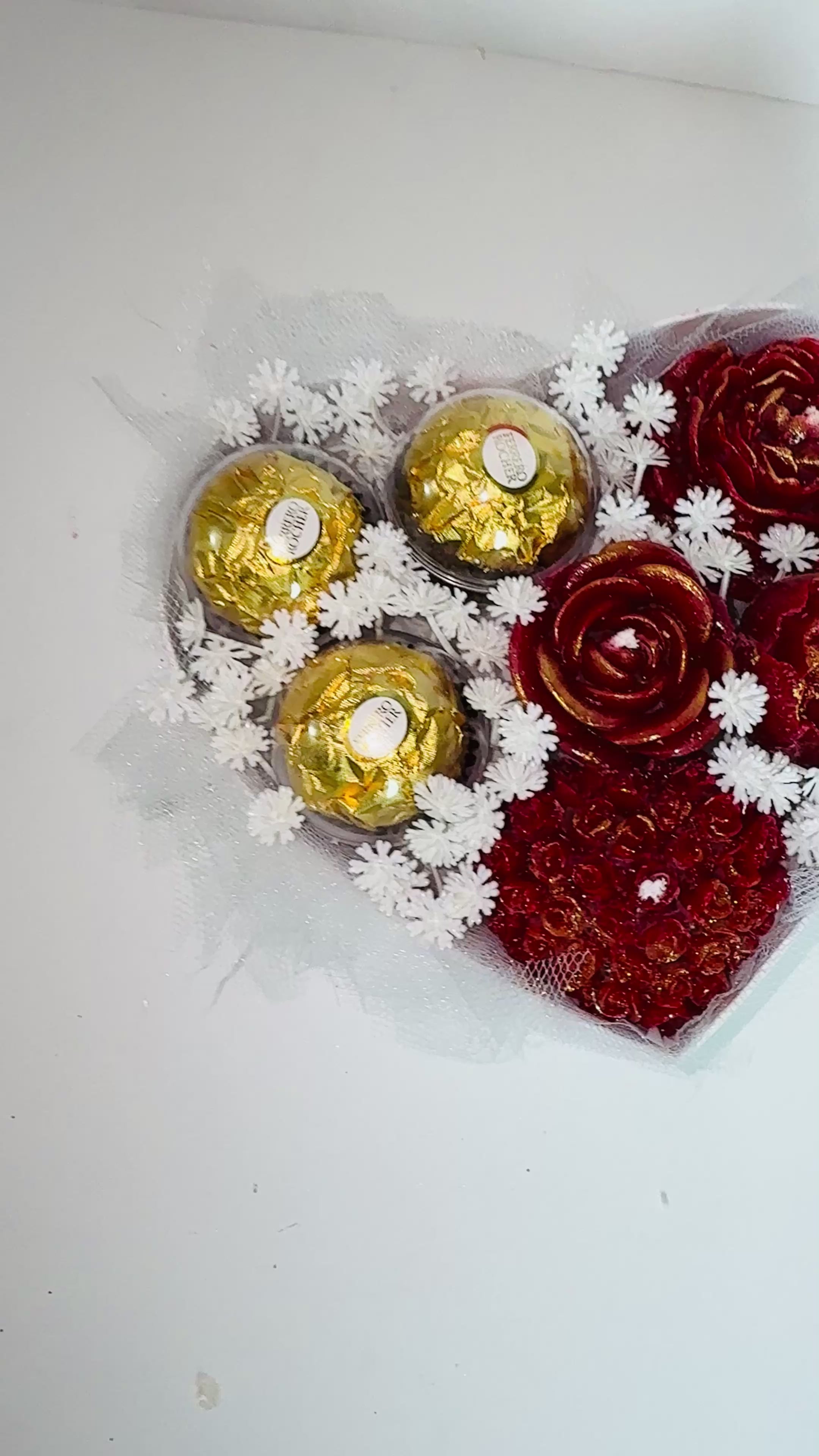Sorprende con un detalle único que combina elegancia, dulzura y un aroma envolvente. Este hermoso arreglo en forma de corazón está elaborado con delicadas flores artesanales hechas de cera de soya natural, acompañadas de finos chocolates que lo convierten en el regalo perfecto para expresar amor en cualquier ocasión especial.