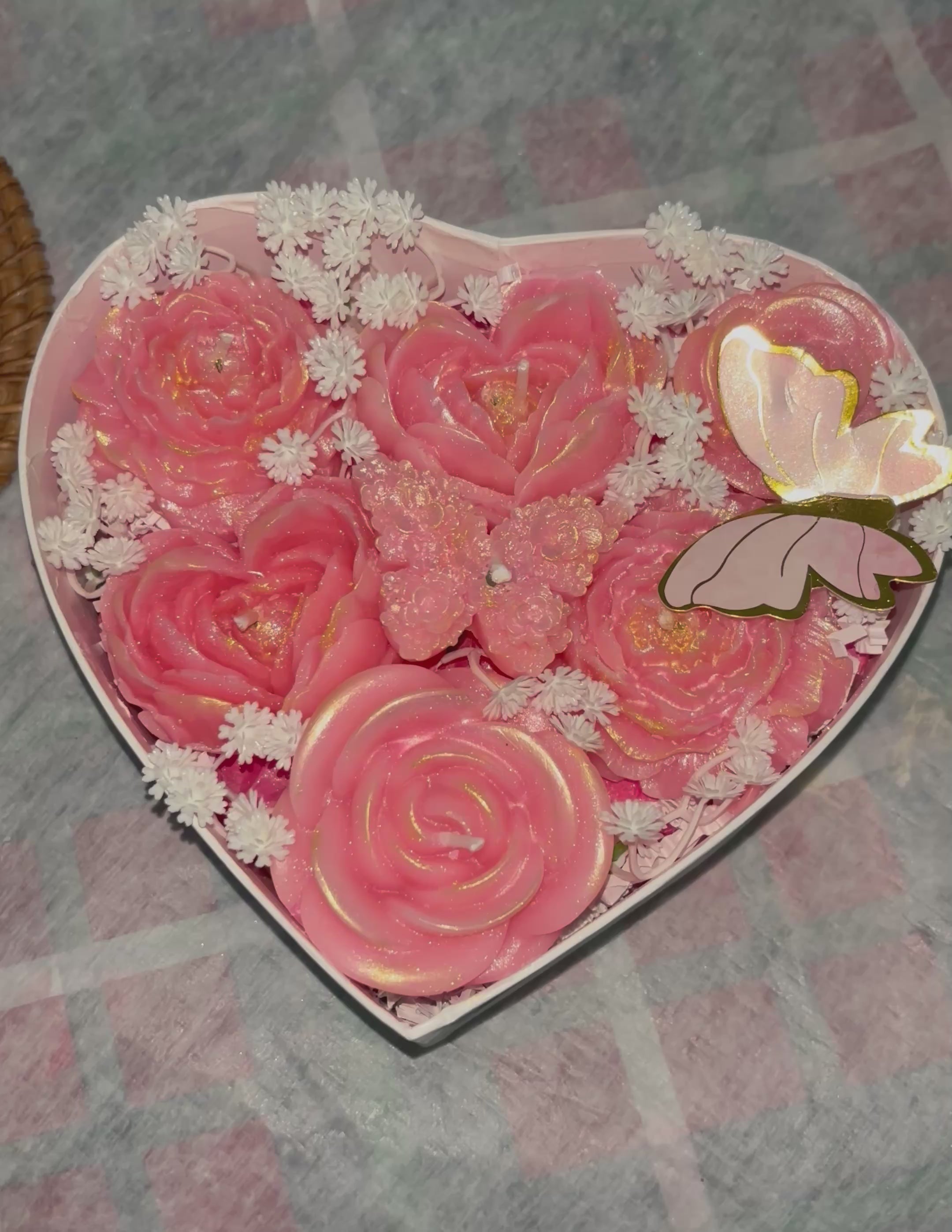 Un arreglo que habla de amor a primera vista. Presentado en una delicada caja en forma de corazón, este diseño combina hermosas flores rosadas elaboradas artesanalmente, acompañadas de pequeños detalles blancos y una mariposa decorativa que simboliza transformación, ternura y nuevos comienzos.
